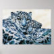 Una madre y un bebé leopardo de las nieves se abrazan en el frío.