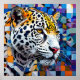 Representación estilizada de la cabeza de un leopardo, que muestra colores vibrantes y patrones geométricos audaces en el fondo. El leopardo se representa de perfil, enfatizando sus características llamativas, como sus ojos ámbar penetrantes, sus prominentes bigotes y sus patrones de manchas únicos. El fondo consiste en una serie de formas coloridas, creando un contraste dinámico con las representaciones más naturalistas del leopardo. El estilo general combina el realismo con el arte abstracto, dándole un sentimiento moderno y enérgico.