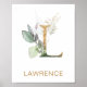 Elegante poster de vivero de letra L monograma con un ilustracion de follaje verde y dorado al estilo acuarela