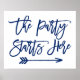 Este letrero dice "La Fiesta Comienza Aquí" en una tipografía de pincel elegante en azul marino.