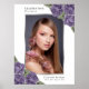 Elegante letrero de bienvenida de celebración de vida/funeral floral púrpura con rosas púrpura y flores de bebé que decoran una foto dentro de un marco de plata. Artículos coincidentes disponibles.