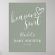 Una señal moderna minimalista de baby shower que presenta un corazón dibujado a mano y tipografía elegante sobre un fondo verde salvia. Diseñado por Thisisnotme©