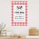 Bienvenidos a los invitados y a la pareja comprometida con un letrero de cartel de I Do BBQ que presenta una versión alegre del clásico patrón de manta de picnic a cuadros rojos y gingham y herramientas para asar con un corazón. Personalice el texto para adaptarlo a las necesidades de su fiesta con casillas de texto flexibles o cambie aún más el diseño utilizando el enlace personalizar más.