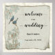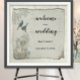Se muestra con marco opcional, cuando agregue al carrito verá opciones de enmarcado. Letrero de Bienvenida de Boda con Pájaros de Amor Sentados en una Rama o en una Enredadera de Damasco Rústico Romántico Vintage Verde Azul. Se muestra con marco personalizado opcional.