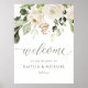 Letrero de bienvenida de boda elegante - Ramo de flores blancas y follaje de vegetación: ¡Bienvenidos a sus invitados de boda con este letrero de bienvenida de 18 x 24 pulgadas! Este letrero cuenta con un hermoso ramo de acuarela con flores blancas, vegetación y un toque de brillo dorado falso. El hermoso "bienvenidos" está hecho en una fuente de caligrafía moderna que complementa perfectamente el diseño.