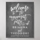 Letrero de bienvenida personalizado para fiesta de compromiso con nombres y hashtag con efecto de pizarra falsa de fondo.