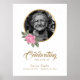 Elegante letrero de bienvenida de foto de funeral rosa y dorado con un marco de foto dorado adornado con rosas rosadas.