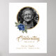 Elegante letrero de bienvenida de foto de funeral azul y dorado con un marco de foto dorado adornado con rosas azules.