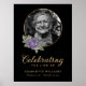 Elegante letrero de bienvenida de foto de funeral floral negro con una foto adornada con rosas púrpuras y aliento de bebé.