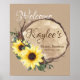 Letrero de bienvenida para ducha decorativa de rebanada de madera rústica y girasoles para complementar nuestras invitaciones.