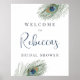 Un letrero de bienvenida boho chic diseñado para coincidir con nuestras invitaciones de despedida de soltera con plumas de pavo real a la acuarela, con un par de plumas de pavo real enmarcando su texto personalizado en elegantes tonos de índigo.