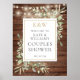 Con hermosas luces de cuerda y delicadas hojas de vegetación en acuarela sobre un fondo de madera rústica, este letrero de bienvenida para la despedida de soltera de la pareja chic puede ser personalizado con las iniciales de tu monograma en oro y la información especial de la boda. Diseñado por Thisisnotme©
