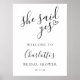 Este elegante letrero de despedida de soltera negro y blanco "ella dijo sí" se puede personalizar con la información de su despedida de soltera especial. Diseñado por Thisisnotme©