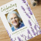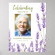 Letrero de bienvenida para funeral con flores de lavanda púrpura, una foto de su ser querido, su nombre y fechas.