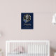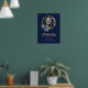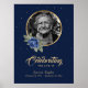 Elegante letrero de bienvenida para funeral con flores azules y doradas con una foto con marco dorado adornado con rosas azules sobre fondo azul. El fondo se puede cambiar a cualquier color.