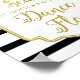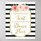 Por favor, encuentre su asiento, pero su lugar está en el cartel de la pista de baile para bodas en patrón de rayas negras y blancas, marco dorado vintage glamuroso, flores vintage rosadas y durazno y estilo de letra a mano.