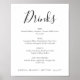 Esta sencilla, pero elegante, señal de bebidas es perfecta para una boda elegante y moderna. El diseño cuenta con un estilo chic, en negro y blanco con caligrafía de moda, escrita a mano. Puedes cambiar el texto a lo que te guste, como tarjetas y regalos, un libro de invitados, una señal conmemorativa, un hashtag de boda, favores, una barra de postres, estación de comida y más. No te detengas solo en bodas, también es ideal para fiestas de soltera, cenas de ensayo, fiestas de compromiso o cualquier ocasión especial. Puedes personalizar el menú de bebidas con lo que te guste. Si necesitas ayuda para personalizar esta señal de boda o deseas que cree productos adicionales y coincidentes, por favor contáctame a través del sistema de mensajería de Zazzle o en admin@albamarie.com. ¡Estaré encantada de ayudarte!