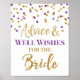 Consejos y buenos deseos para el letrero de la novia para la ducha de la novia en patrón de confeti dorado y púrpura oscuro. Tenga en cuenta que el efecto brillantes es solo un efecto fotográfico.