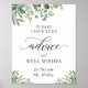 Agrega un toque de naturaleza a tu boda con nuestra Señal de Consejos y Deseos de Hojas de Eucalipto. Con hermosa vegetación, esta señal es perfecta para que los invitados dejen sus palabras de sabiduría y amor para los recién casados. Hecha con materiales de alta calidad, esta señal lucirá hermosa en exhibición en tu boda y será un bonito recuerdo para atesorar durante años. La opción de descarga digital también te permite imprimirla en casa o hacer que se imprima profesionalmente.