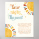 Esta encantadora señal presenta un diseño boho con un adorable sol acuarela, colocado sobre un suave fondo blanco vintage. Los colores suaves de amarillo, naranja y azul, junto con la fuente retro, crean un aspecto encantador y caprichoso. Pida a los invitados que escriban un mensaje divertido o alentador en un pañal para esos cambios de noche. Esta señal seguramente traerá sonrisas y momentos dulces a la ducha de su bebé.