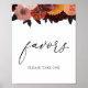 Letrero de favores con una ilustración de flores y follaje de color borgoña, sonrosado y naranja con la palabra "favores" en un divertido tipo de letra de caligrafía.