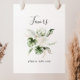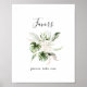 Este letrero de favores de follaje tropical dorado es perfecto para una boda de destino o una ducha de novia. El diseño presenta hojas de palma y plátano doradas y verdes pintadas a mano con acuarela y flores rosadas dispuestas ordenadamente en hermosos ramos.