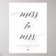 El Letrero de Fiesta de Despedida de Soltera Miss a Mrs con Caligrafía Elegante presenta tipografía chic en negro y blanco, combinando simplicidad con elegancia moderna para dar la bienvenida a sus invitados a su fiesta de despedida de soltera con estilo. Si necesita ayuda o personalizaciones, no dude en hacérnoslo saber – estamos aquí para ayudar a que su fiesta de bodas sea verdaderamente especial.