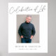 Este letrero conmemorativo moderno presenta un fondo blanco clásico, una foto vertical única y tipografía simple pero elegante. El texto en el frente dice "Celebración de la Vida". Este diseño se coordina con otros artículos conmemorativos en nuestra tienda, como tarjetas de agradecimiento y tarjetas de recuerdo.