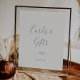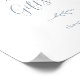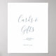 Este letrero de tarjetas y regalos azul polvo con hoja mínima es perfecto para una boda elegante o una ducha de novia. El diseño presenta una silueta simple de vegetación en azul pizarra claro con estilo minimalista clásico. La línea de texto en la parte inferior del letrero se puede personalizar con la fecha, los nombres de la novia y el novio, o un mensaje corto como "Gracias". Este letrero se puede utilizar para una boda o cualquier evento o fiesta.