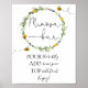Letrero de la barra Mimosa con una corona de acuarela de follaje y flores amarillas con abejas zumbando y las palabras barra Mimosa en un divertido tipo de letra de caligrafía.
