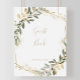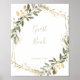 Este letrero de libro de invitados de otoño con vegetación dorada geométrica es perfecto para una boda moderna o una ducha de novia. El diseño cuenta con un hermoso marco geométrico dorado con hojas verdes elegantes.