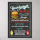 Cartel de menú de barra de hamburguesas en pizarra para su próxima fiesta. Cuenta con una deliciosa hamburguesa, botella de kétchup y mostaza, con fuentes divertidas. Toda la redacción se puede cambiar debajo de la palabra "delicioso"