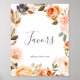 Este letrero de recuerdos de boda florales de tierra rústica es perfecto para una boda de otoño. El diseño elegante de tonos terrosos presenta flores rústicas de acuarela en tonos de terracota, cobre, naranja quemada, melocotón, rosa suave y blanco crema con estilo boho vintage.