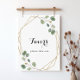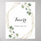 Este letrero de regalos de bodas con caligrafía moderna geométrica dorada es perfecto para una boda rústica o ducha de novia. El diseño presenta ramas y hojas de eucalipto verde botánico dibujadas a mano que adornan un marco elegante.