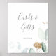Esta señal de tarjetas y regalos de vegetación aireada y hojas de oro es perfecta para una boda moderna o una despedida de soltera. El elegante diseño botánico presenta eucalipto ligero y aireado pintado a la acuarela acentuado con hojas caprichosas de purpurina dorada. La línea de texto en la parte inferior de la señal se puede personalizar con la fecha, los nombres de la novia y el novio, o un mensaje corto como "Gracias". Esta señal se puede utilizar para una boda o cualquier evento o fiesta.