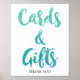 Esta señal de tarjetas y regalos de playa con caligrafía de acuarela es perfecta para una boda con tema de destino tropical o una ducha de novia. El diseño divertido y energético presenta una hermosa fuente de escritura de acuarela con gradiente de color verde tiza y azul aqua. La línea de texto en la parte inferior de la señal se puede personalizar con la fecha, los nombres de la novia y el novio, o un mensaje corto como "Gracias". Diseñado con cariño por Miriam en Fresh & Yummy Paperie. Para artículos coordinados, por favor visite mi tienda Zazzle: