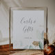 Esta señal de tarjetas y regalos de vegetación aireada y hojas de oro es perfecta para una boda moderna o una despedida de soltera. El elegante diseño botánico presenta eucalipto ligero y aireado pintado a la acuarela y acentuado con hojas caprichosas de purpurina dorada. La línea de texto en la parte inferior de la señal se puede personalizar con la fecha, los nombres de la novia y el novio, o un mensaje corto como "Gracias". Esta señal se puede utilizar para una boda o cualquier evento o fiesta.