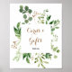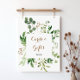 Esta elegante señal de tarjetas y regalos de follaje de eucalipto es perfecta para una boda tropical o una despedida de soltera. El diseño presenta hermosas hojas verdes de eucalipto pintadas a mano artísticamente y dispuestas en formas geométricas, inspirando belleza natural. Haz que la línea de texto en la parte inferior de la señal sea tuya incluyendo la fecha, los nombres de la novia y el novio o un mensaje corto como "Gracias". Esta señal puede complementar una boda, cualquier evento o fiesta.