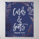 Esta elegante señal de tarjetas y regalos en rosa oro y azul marino es perfecta para una boda elegante o una despedida de soltera. El diseño presenta un impresionante marco frondoso de color rosa pálido sobre un fondo azul oscuro y está combinado con una fuente cursiva deslumbrante. La línea de texto en la parte inferior de la señal se puede personalizar con la fecha, los nombres de la novia y el novio, o un mensaje corto como "Gracias".