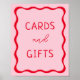 Letrero de tarjetas y regalos ondulados rosados y rojos retro