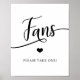 Diseño simplemente elegante en letras de topografía de guión negro y fondo blanco y letras negras. Pequeño corazón en el medio. Letrero de FANS para boda o ducha de novia para cualquier época del año o tema. Coloque el letrero en la mesa donde los invitados pueden tomar uno en la entrada