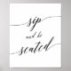 Este letrero elegante de caligrafía negra para brindar y sentarse es perfecto para una boda sencilla. El diseño neutral presenta un cartel minimalista decorado con tipografía romántica y caprichosa.