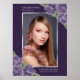 Elegante letrero de bienvenida de celebración de vida/funeral con flores moradas con rosas moradas y flores de bebé que decoran una foto dentro de un marco plateado. Artículos coincidentes disponibles.