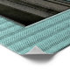 Esta es una foto de la Estatua de la Libertad, con un cielo azul detrás de ella, y un borde verde texturizado que coincide con el color de su piel de cobre.