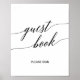 Este letrero de libro de firmas de boda con letra caligráfica negra elegante es perfecto para una boda sencilla. El diseño neutral presenta un cartel minimalista decorado con tipografía romántica y caprichosa.