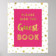 Por favor, firme nuestro cartel del libro de invitados para la fiesta de bebé, la ducha de la novia o la boda en rosa fucsia brillante y blanco con patrón de confeti dorado y texto con estilo de letra a mano. Perfecto para una fiesta de bebé, boda, cumpleaños o ducha de la novia.