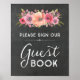 Por favor, firme nuestro cartel de libro de invitados para baby shower, despedida de soltera o boda en estilo rústico de campo con flores de acuarela primaverales y patrón de pizarra en tonos de rosa y melocotón con texto de estilo letra a mano. Perfecto para una fiesta de bebé, boda, cumpleaños o despedida de soltera.