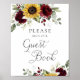 Libro de firmas de boda con girasoles, flores y follaje de Borgoña. Señalización de boda rústica.