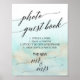 Esta señal de libro de invitados de foto de playa con acuarela de color agua y dorado es perfecta para una boda en un destino tropical. El diseño simple y moderno presenta una impresionante acuarela turquesa, verde azulado y azul claro con un brillo suave dorado que recuerda la arena y el mar. Está combinado con una hermosa caligrafía elegante.