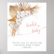 Esta señal de fiesta de bebé es exótica, elegante y chic. Esta hermosa colección está llena de vida, cálida como una playa soleada en un lugar lejano. Las hojas de palma boho chic y las flores blancas contrastan hermosamente con el fondo de terracota en la parte posterior, agregando un toque elegante a esta colección.